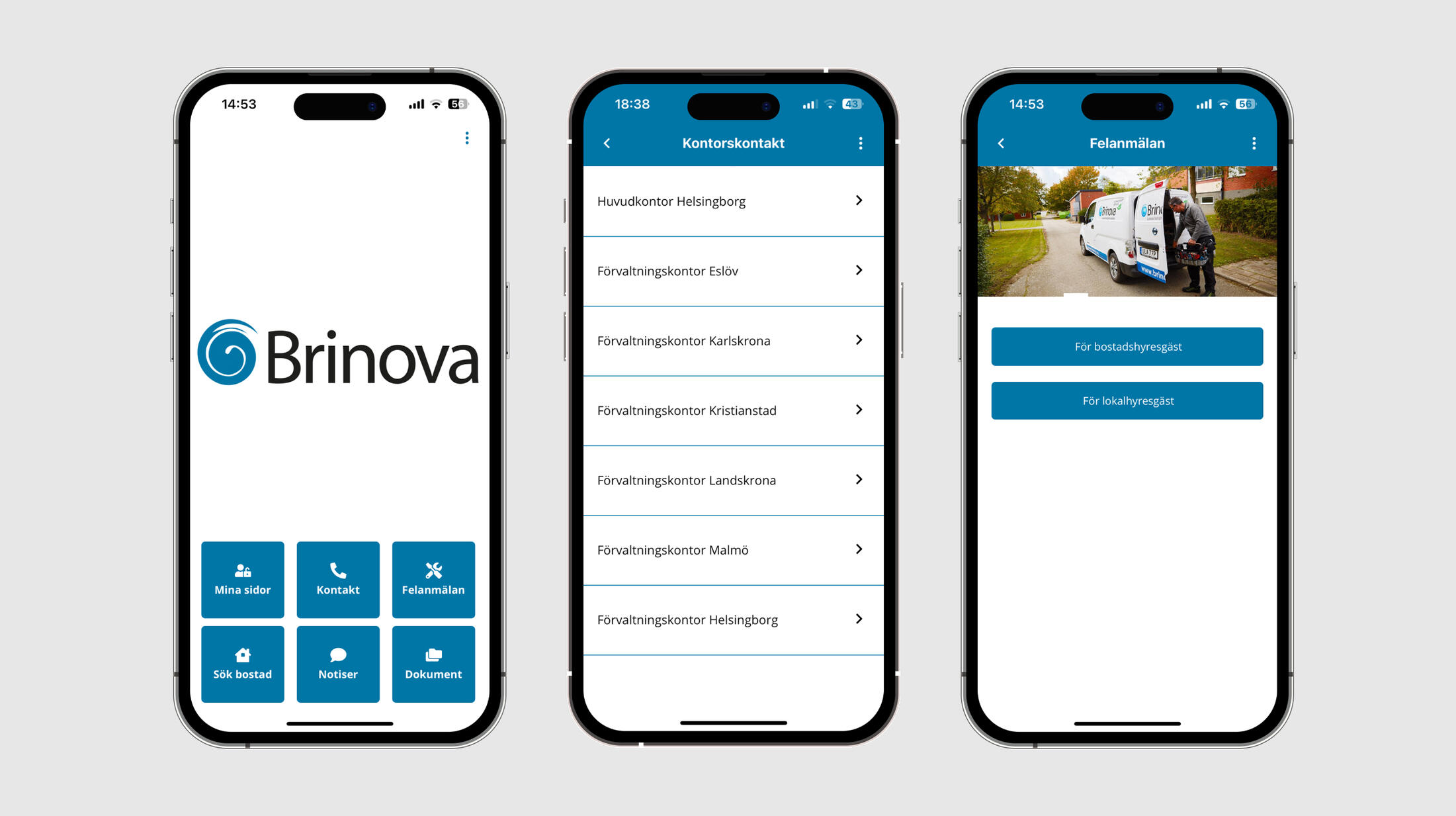 Brinova Fastigheter AB, a real estate company with a strong presence in southern Sweden, needed a modern tenant-facing app to improve communication and make property-related information easily accessible. I was responsible for the UI/UX design of the app, with a focus on clarity, responsiveness, and usability for both tenants and administrators.