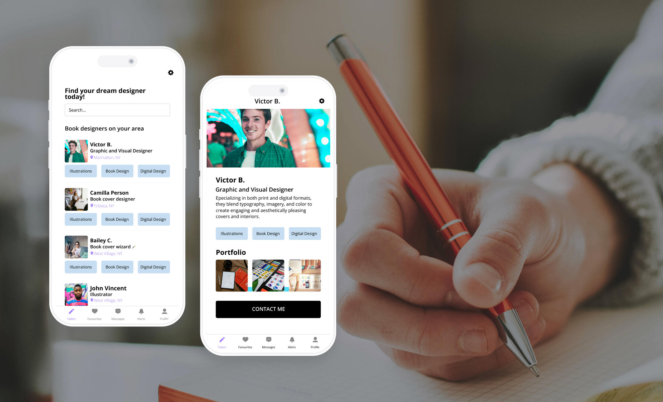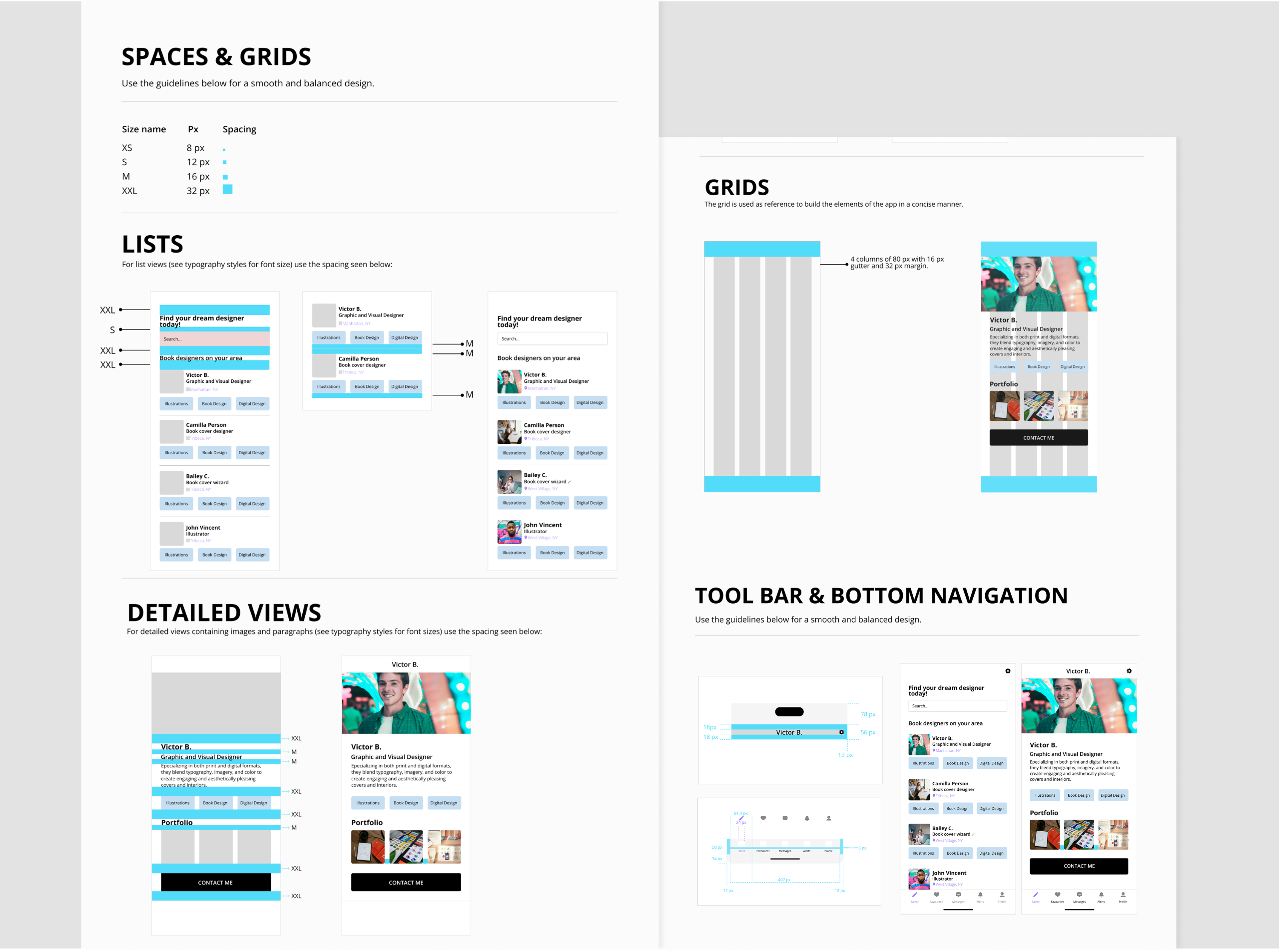 A marketplace app connecting authors and publishers with talented book designers and illustrators. Designed a cohesive visual identity and comprehensive style guide to ensure consistent branding and seamless user experience.